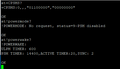 AT+CPSMS? command showed PSM is disabled (+CPSMS:0,“00011000”,“00001010”)